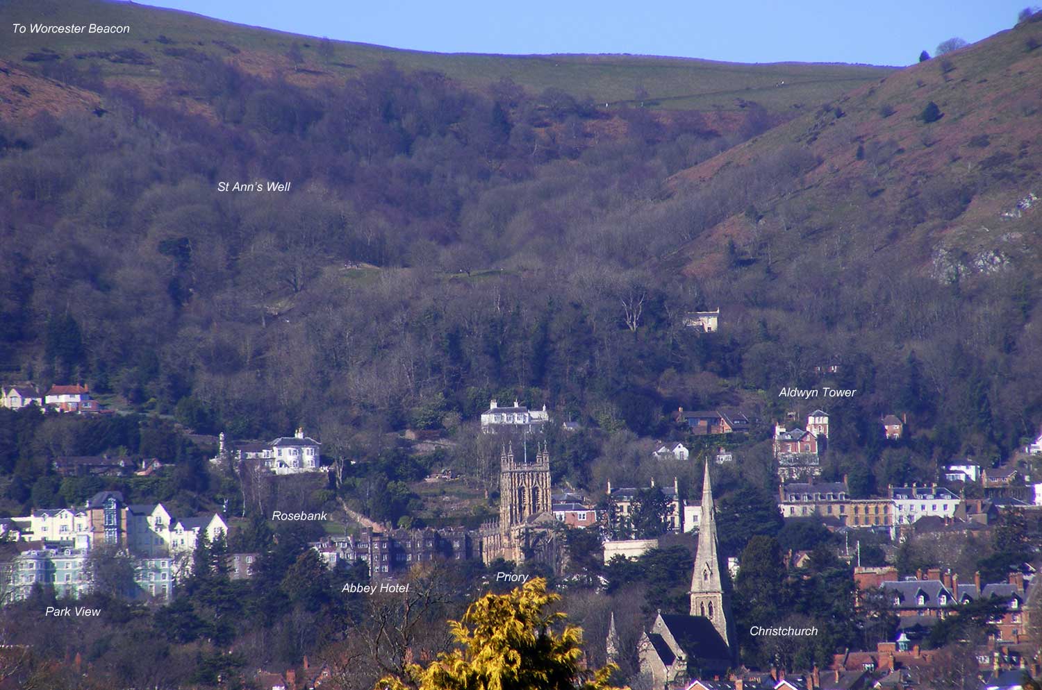 ContentsModern timesThe town of Malvern in the county of Worcestershire in the UK comprises in fact a number of settlements. These mostly run along and below the eastern slope of the Malvern Hills including Malvern Wells to the south, Great Malvern, shown in the photograph above nestling in the centre of the Malvern Hills, and Malvern Link, a light industrial area, to the north east. Spectacular views towards Hereford are to be had from houses in West Malvern but the roads are congested and parking is difficult here. At the bottom of the hills on the eastern side lies Barnards Green. On the left of the photo above are the buildings where the water cure doctors practised in Victorian times. Middle left can just be seen the Abbey Hotel clad in Virginia Creeper next to the tower of Great Malvern Priory, and below the spire of Christchurch in Avenue Road. Middle right can be see the spire of the United Reform church built a hundred yards south of the house where Princess Victoria stayed in 1830, and bottom right can just be seen the spire of Lansdowne Methodist church. The Malvern Hills in the background rise to a height of 425 metres, and are popular with walkers. Photographs of the area can be found in several publications in the local reference section of Great Malvern library, including (ref 1). Early daysGeologists currently think the earth was created about 4,000 Millennia ago. Land masses gradually moved huge distances around the globe until they are where they are today. Approximately 600 Millennia ago an eruption of hot lava under the sea formed the ridge which was to become the Malvern Hills. Much later, and before man existed, a vast river swept through the area between the Malverns and Evesham washing away the sediment, so that when the waters fell the ridge of the hills was eventually exposed. Skip the emergence of life on earth, climate change and ice ages, by 1066 the area around Malvern became a sparsely populated farming community with main settlements at Powick and Hanley with hamlets and farms in wooded wastes, probably surrounded by their own field systems. ![]() The south side of Great Malvern Priory Following the Norman Conquest in 1066 a monastery was set up in Great Malvern under Aldwyn and the Priory became the area's principal landowner. Between 1348 and 1350 the Black Death halved the population of England and the number of monks was reduced to ten as they looked after the dying people. The Priory at the centre of Great Malvern was ransacked in 1539 when King Henry VIII ordered the dissolution of the monasteries, but in 1541 John Pope and other townspeople were able to purchase the Priory for £20. There followed a long period during which the people of Malvern struggled to find funds to restore and maintain the building which we enjoy today. Malvern remained a quiet rural backwater until about 1756 when Dr John Wall analysed the water from various springs and the concept of hydrotherapy gradually took hold as in other countries, such as Germany. A boost was given to the 'water cure' in 1842 when Dr James Wilson and Dr James Manby Gully set up a hydrotherapy establishment at the Crown hotel. As the idea took off, hotels were built and more people visited the town to benefit their health. The gentry would, for example, meet at the reading room of the Royal Library at what is now Barclays bank before venturing up the steep lane next to the Unicorn Inn to St Ann's Well. Donkey rides were available for those who preferred not to walk. In 1830 the Duchess of Kent brought Princess Victoria, age 12, for a holiday, staying at Holly Mount Mansion on the Worcester Road. The Guesten Hall of the Priory was demolished about 1841 to make way for the Abbey Hotel. It had provided accommodation for the guests of the Prior, and it is thought that Henry VII, his wife and sons Arthur and Henry may have stayed here circa 1500. Drawings of the Guesten Hall hang in Malvern Museum.