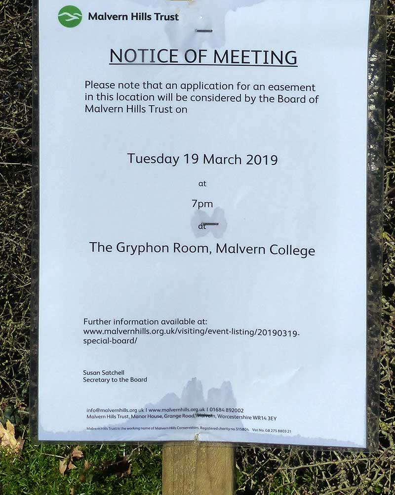 Archived newsSpecial Board meeting of the Malvern Hills Trust, Tuesday 19th March 2019The Special Board meeting to discuss the controversial Chance Lane Easement, twice postponed, has been rearranged for Tuesday 19th March 2019. Venue: The Gryphon Room, Malvern College, Thirlstane Road, WR14 3PL Time: 7:00 - 9:00 pm Please do come along to this very important meeting to show your support for refusing this application to build a large access road across the common adjoining the Guarlford Road, and bring your friends. Directions: from Court Road turn into Thirlstane Road, proceed under railway bridge and immediately turn right for the Gryphon Room and Sports Complex. Click for map of Malvern College Click to view Malvern Hills Trust Calendar