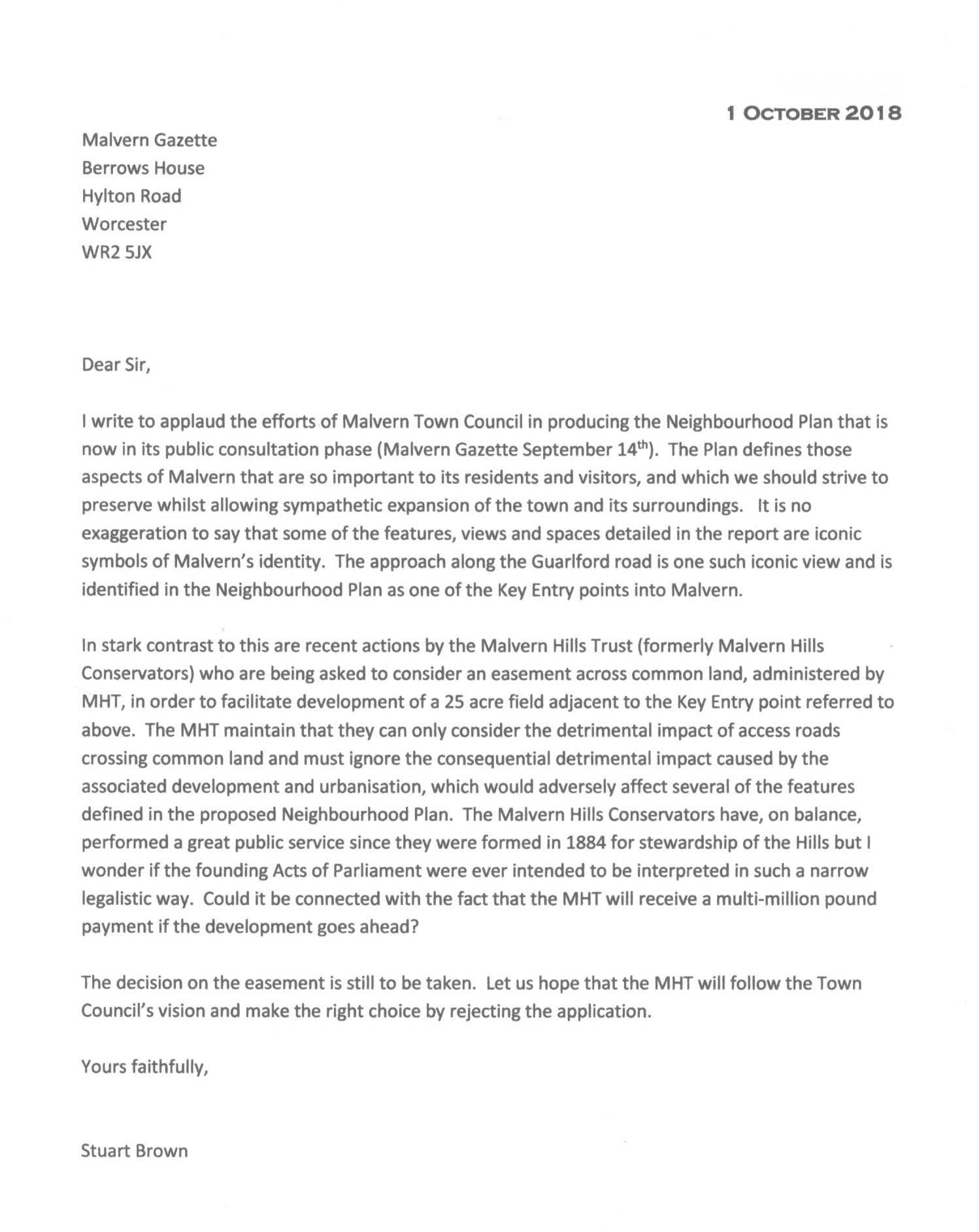 Photocopy of letter published in the Malvern Gazette on 5th October 2018.